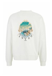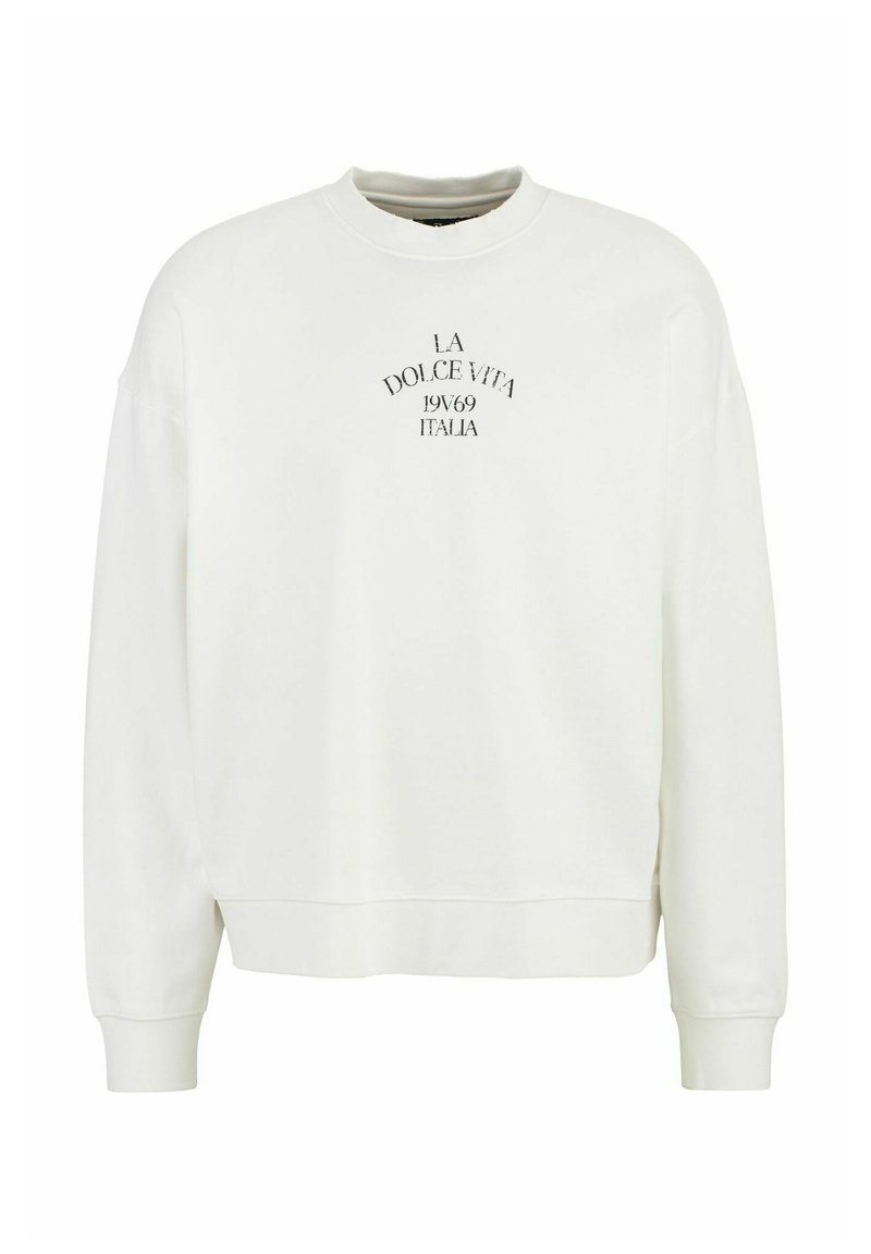 Weißes Sweatshirt mit Rundhalsausschnitt, langen Ärmeln und gerippten Bündchen. Mit schwarzem, gesticktem Text "LA DOLCE VITA 1969 ITALIA" auf der Vorderseite.
