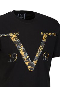 Schwarzes T-Shirt mit einem großen dekorativen gold- und graumusterierten Buchstaben V über der Brust, dazu das Jahr "1969" darunter.