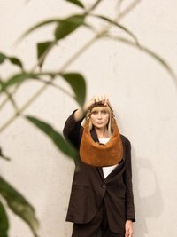 Blonde Frau in dunkelbraunem Anzug hält eine hellbraune Wildleder-Handtasche vor einer einfarbigen beigen Wand, im Vordergrund unscharfe grüne Blätter.