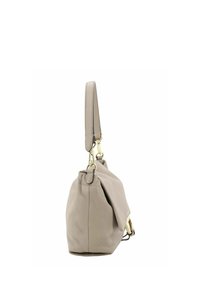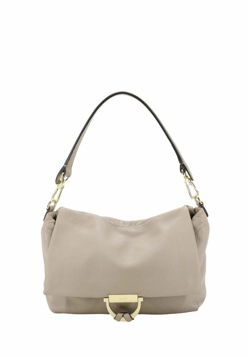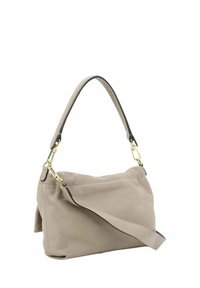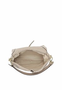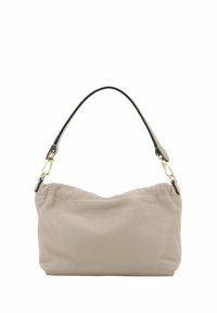Beige Leder-Schultertasche mit weicher Textur, schwarzem Riemen mit goldenen Verschlüssen und goldfarbenem dekorativem Verschluss auf der Vorderseite.