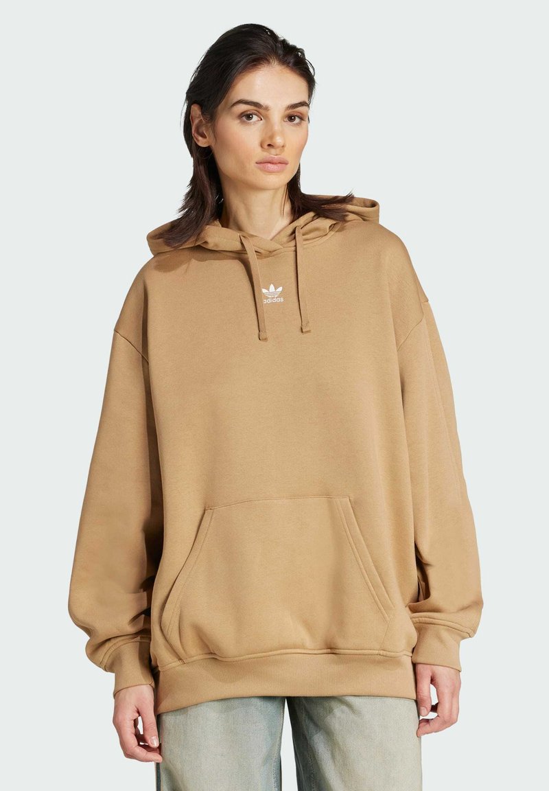 Frau trägt übergroßen hellbraunen Hoodie mit Fronttasche und Adidas-Logo, kombiniert mit hellblauen Jeans vor einfachem Hintergrund.