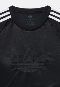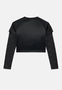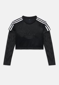 Schwarzes kurzes Sporttop mit schwarzen, gemusterten langen Ärmeln, drei weißen Streifen auf den Schultern und einem dezenten schwarzen Logo in der Mitte.