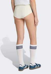 Hoch geschnittene cremefarbene Shorts mit schwarzen Streifen, kombiniert mit kniehohen weißen Socken mit blauen Streifen und blauen Schuhen mit Riemen.