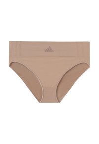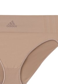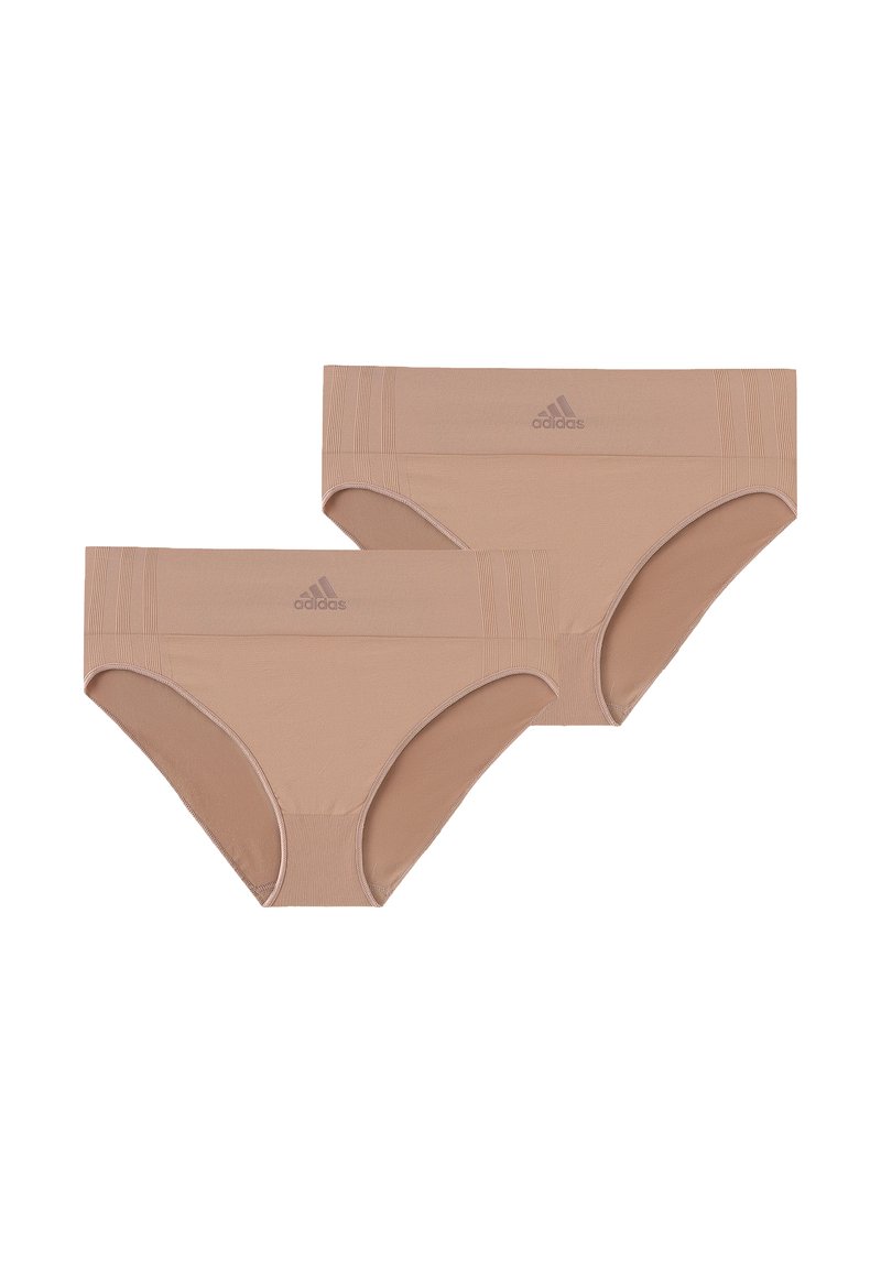 Zwei beige, nahtlose Hipster-Unterhosen von Adidas mit geripptem Bund und mittig platziertem Logo auf jedem Paar.