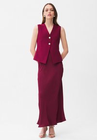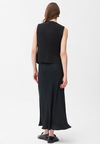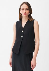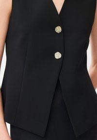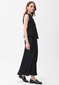 Frau trägt eine ärmellose schwarze Weste mit goldenen Knöpfen, einen langen schwarzen Rock und schwarze Loafers, steht vor einem weißen Hintergrund.