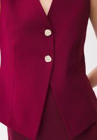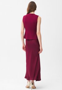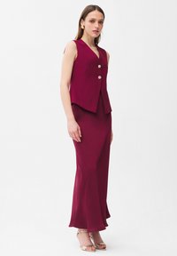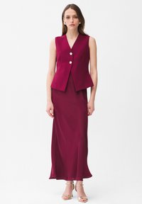 Frau steht mit den Händen hinter dem Rücken, trägt eine ärmellose weinrote Weste mit zwei Knöpfen und dazu passenden langen Rock sowie beigefarbene Absätze.