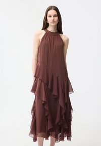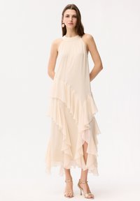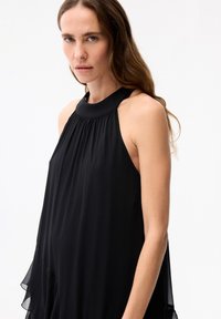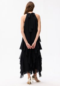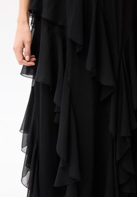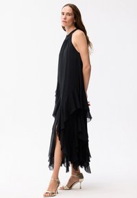 Frau trägt ein ärmelloses, schwarzes, asymmetrisches Kleid mit gestuften Rüschen und Seitenschlitz, kombiniert mit goldenen Sandalen mit hohen Absätzen.