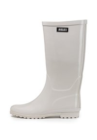 Hoher matter hellgrüner Gummiregenstiefel mit profilierter Sohle und schwarzem rechteckigem AIGLE 1853-Logo nahe dem oberen Rand.