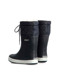 Schwarzer Gummistiefel bis zur Mitte der Wade mit gesteppter Stoffmanschette, Kordelzugverschluss, weißer Sohle und "AIGLE"-Logo an der Seite.