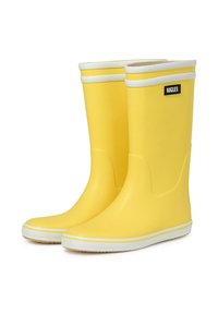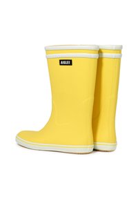 Gelber Gummiregenstiefel mit weißem Rand und Sohle, mit einem schwarzen Etikett mit weißem "AIGLE 1853"-Schriftzug auf der Oberseite.