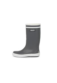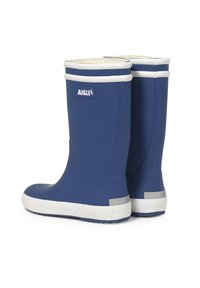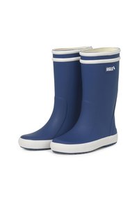Blauer gummierter Regenstiefel bis zur Mitte der Wade mit weißer Sohle und Besatz, mit einem rechteckigen Logo-Patch mit der Aufschrift „Aigle“ an der oberen Außenseite.