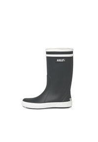 Roter wasserdichter Gummiregenstiefel mit weißer Sohle und Besatz, mit dem Markenname „Aigle“ an der Oberseite.
