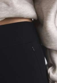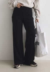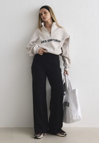 Person trägt schwarze weite Hosen, beige Sweatshirt, Turnschuhe, hält eine weiße Tragetasche mit schwarzem Text vor schlichte Hintergrund.