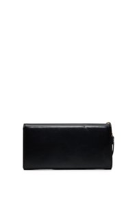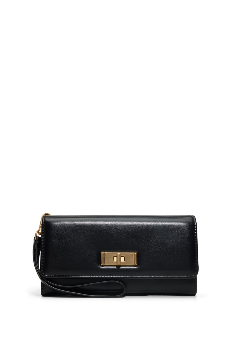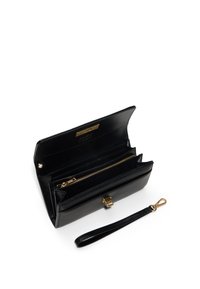 Schwarzes Lederarmband-Portemonnaie mit goldfarbenem Drehverschluss und abnehmbarem Riemen, dargestellt auf weißem Hintergrund.
