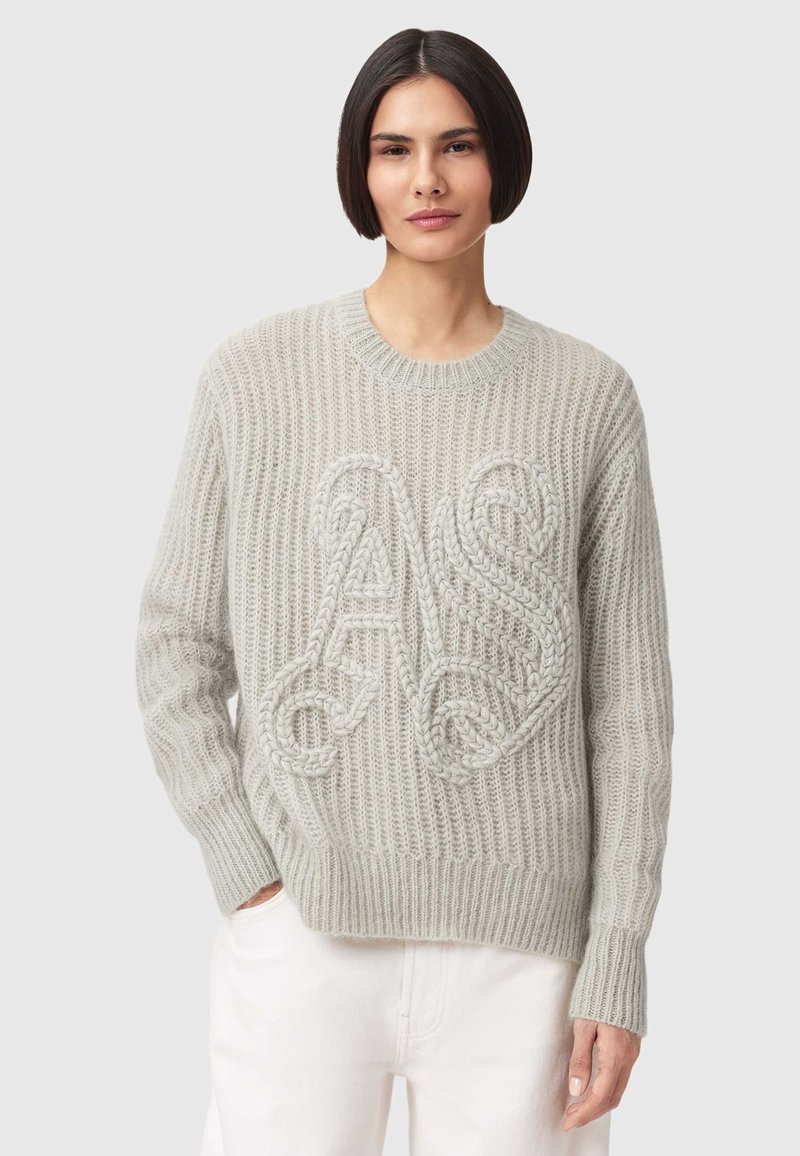Hellgrauer Strickpullover mit einer strukturierten, gerippten Struktur und auffälligem Zopfmuster mit den Initialen „AS“. Rundhalsausschnitt und lange Ärmel.