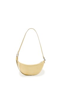 Dunkelburgunderfarbene Leder-Schultertasche mit geschwungenem Design. Verfügt über einen Reißverschluss, einen verstellbaren Tragegurt und Akzente aus goldfarbenem Metall.