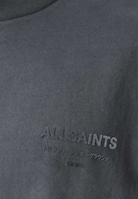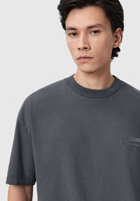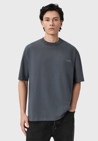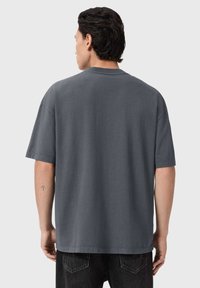 Junger Mann mit dunklen Haaren trägt ein übergroßes dunkelgraues T-Shirt mit dezentem Text auf der Brust und schwarze Jeans, steht vor einfachem Hintergrund.