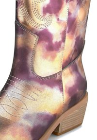 Frau trägt metallic gemusterte Cowboy-Stiefel und ein gelbes, gerafftes Kleid, sie steht vor einem schlichten Hintergrund.