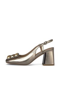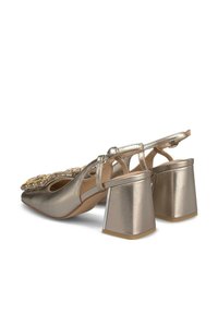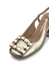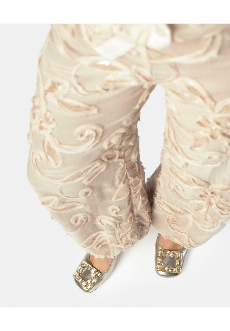 Beige strukturierte Hose mit Blumenmustern und silbernen flachen Schuhen mit großen quadratischen goldenen Verzierungen an den Zehen.