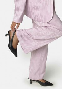 Person, die den Knöchelriemen an einem schwarzen Kitten-Heel-Schuh anpasst, trägt strukturierte, hellrosa, weit geschnittene Hosen und ein passendes Blazer.