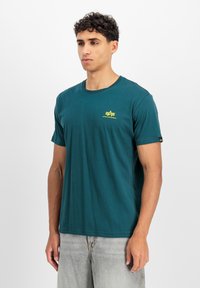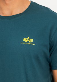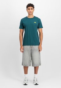 Mann mit lockigem Haar, der ein türkisfarbenes T-Shirt mit großem vertikalem gelbem "ALPHA INDUSTRIES" Schriftzug auf dem Rücken trägt, kombiniert mit hellen Jeansshorts.