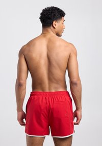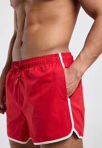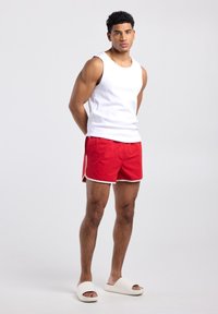 Muskulöser Mann mit kurzen lockigen Haaren, der rote Badeshorts mit weißem Rand, eine goldene Kette und Ohrringe trägt und nach links blickt, vor einem einfarbigen Hintergrund.