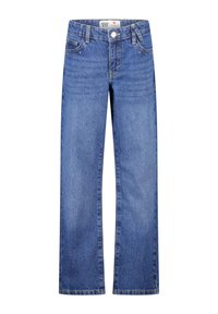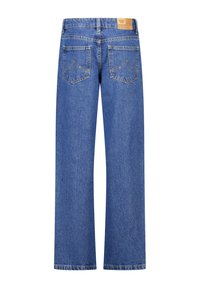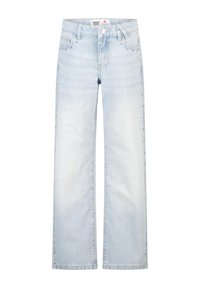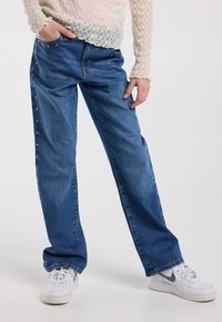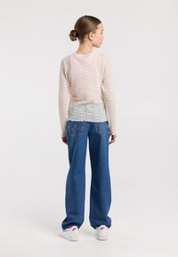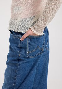 Mädchen steht mit der Hand in der Tasche und trägt ein durchsichtiges langärmliges Spitzenoberteil, blaue Jeans mit seitlichen Knöpfen und weiße Turnschuhe vor weißem Hintergrund.