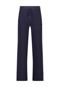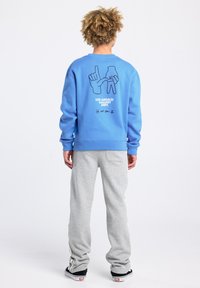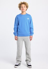 Blauer Pullover mit Rundhalsausschnitt, kombiniert mit grauer Jogginghose mit Seitenstreifen. Das Modell trägt schwarze Sneakers mit weißen Schnürsenkeln.