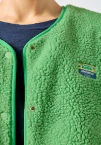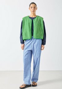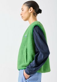 Junge Person mit zurückgebundenem Haar, die eine grüne Fleeceweste über einem dunkelblauen Langarmshirt und blau gestreiften Hosen trägt, vor weißem Hintergrund stehend.