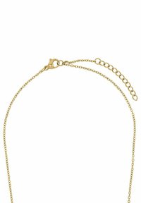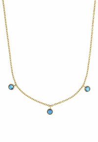 Goldene Kettenhalskette mit drei gleichmäßig entlang der Länge verteilten blauen Edelsteinen, die vor einem hellen, gerippten Oberteil platziert ist.