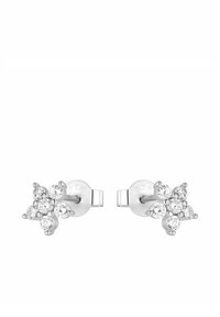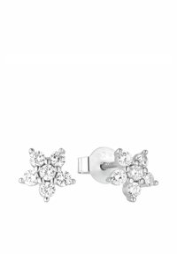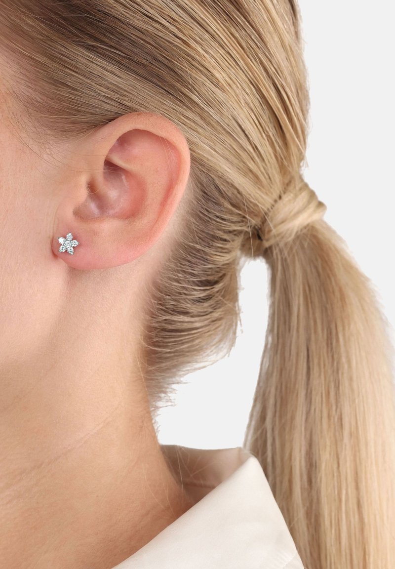 Nahaufnahme eines Ohres einer Frau mit einem kleinen blumenförmigen Diamantstecker, blonden Haaren, die zu einem Zopf gebunden sind, und einem weißen Hemdkragen.