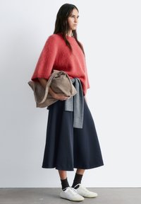 Frau mit langen dunklen Haaren, die einen lockeren roten flauschigen Pullover mit Dreiviertelärmeln trägt und einen grauen Pullover um die Taille gebunden hat.