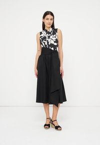 Frau steht und trägt ein ärmelloses schwarz-weißes Oberteil mit Blumenmuster, einen schwarzen Midi-Rock mit einer großen, gebundenen Taillenschärpe und schwarze Keilsandaletten.