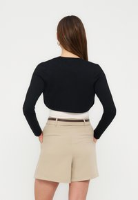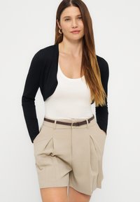 Frau trägt ein schwarzes, kurz geschnittenes, langärmeliges Bolero über einem weißen Oberteil, kombiniert mit beigefarbenen, hochtaligen, plissierten Shorts und einem braunen Gürtel, posiert mit einer Hand in der Hüfte.
