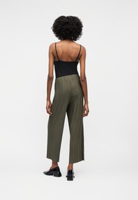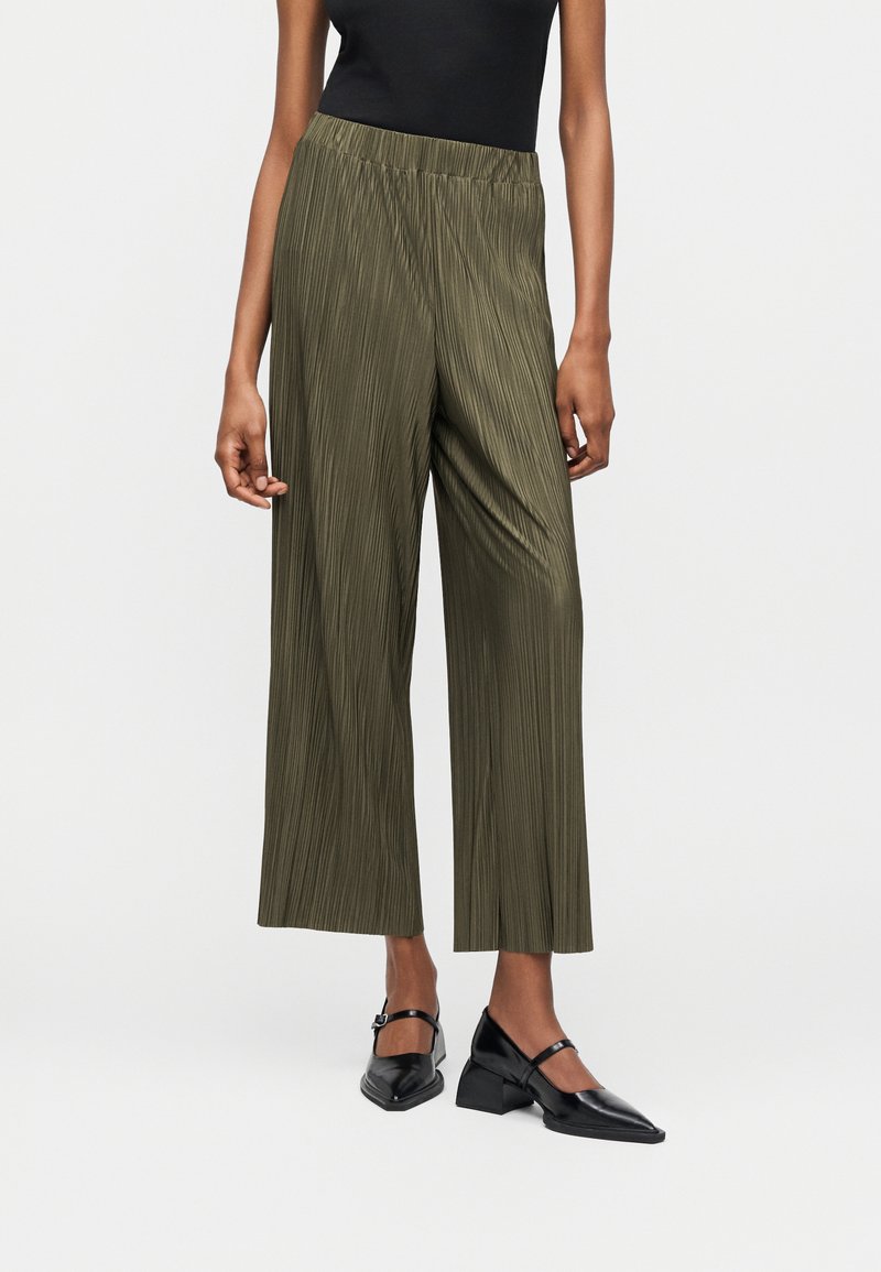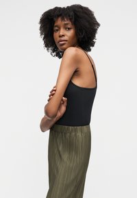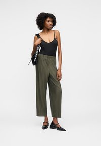 Frau trägt olivgrüne, weit geschnittene, plissierte Hosen, schwarzes ärmelloses Oberteil und schwarze Mary Jane Schuhe mit niedrigem Absatz, steht vor weißem Hintergrund.