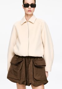 Frau trägt eine beige Zip-up-Jacke und braune High-Waist-Shorts mit großen Frontklapptaschen, kombiniert mit schwarzen rechteckigen Sonnenbrillen.