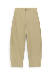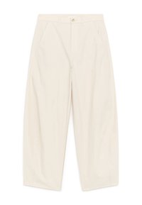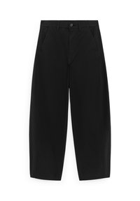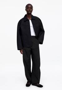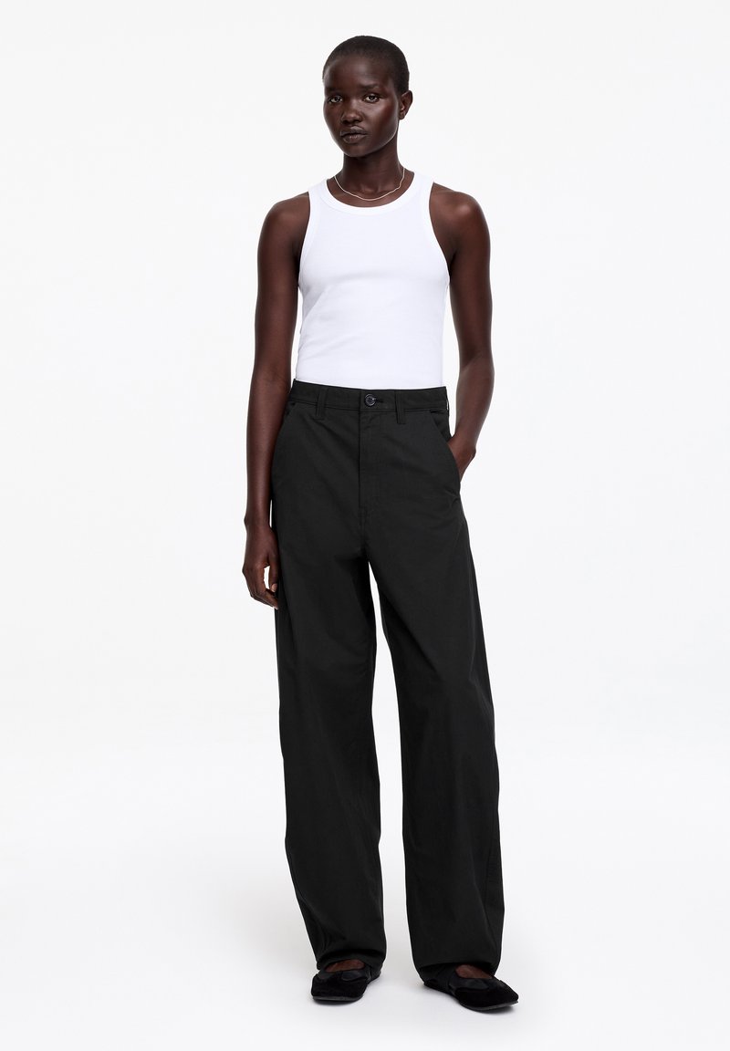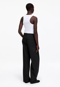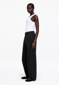 Frau steht und trägt ein weißes ärmelloses Oberteil, schwarze Hosen mit weitem Bein, schwarze Schuhe, mit einer Hand in der Tasche vor einem weißen einfarbigen Hintergrund.