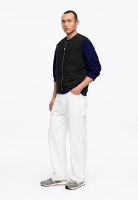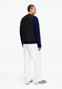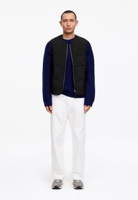 Mann trägt eine schwarze gesteppte Weste über einem blauen Pullover und weißen Hosen, steht mit einer Hand in der Tasche vor einem einfarbigen weißen Hintergrund.