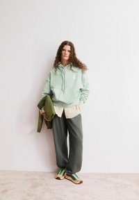 Person mit langen lockigen Haaren, die einen hellgrünen Hoodie, lockere dunkelgraue Hosen und beige-braune Turnschuhe mit grünen Schnürsenkeln trägt und vor weißem Hintergrund steht.