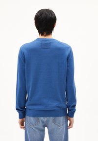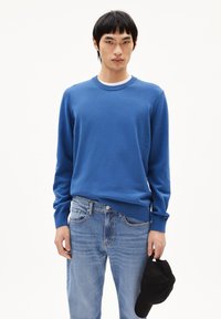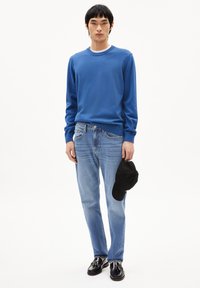 Blauer Baumwollpullover mit rundem Halsausschnitt und gerippten Bündchen, kombiniert mit hellblauen Jeans. Einfaches Design, keine Muster oder Akzente.