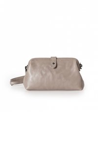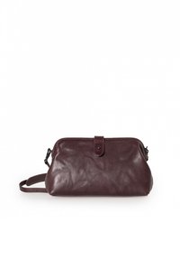 Burgunderfarbene Ledertasche mit Reißverschluss, die gestreiftes Innenfutter und Kartenfächer sichtbar zeigt. Griff mit befestigtem Clip sichtbar.