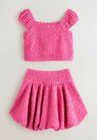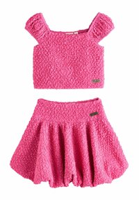 Rosa strukturiertes zweiteiliges Outfit mit kurz puffigen Ärmeln am Croptop und ausgestelltem Rock, beide mit kleinem metallischem Markenzeichen versehen.