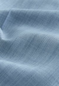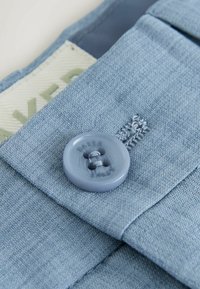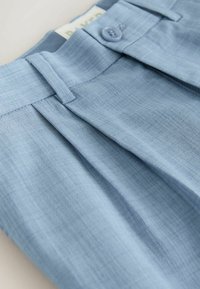 Hellblaue, maßgeschneiderte Hose aus strukturiertem Stoff mit flacher Vorderseite, zwei schrägen Seitentaschen und einem einzigen Knopfverschluss.