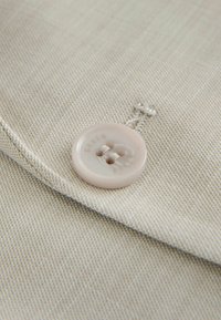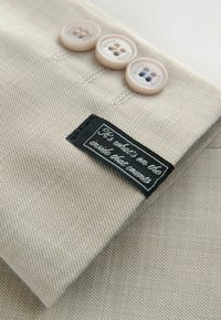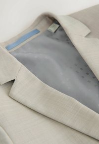 Hellbeiger, taillierter Blazer mit einem Knopfverschluss, eingeschnittenem Revers, zwei Fronttaschen und strukturiertem Stoff. Gefüttert mit hellgrauem Muster.