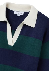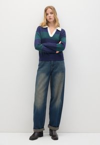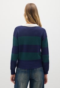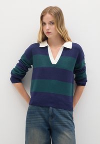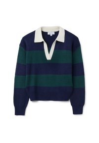 Der blau-grün gestreifte Pullover aus der B.Angel-Linie ist ein ideales Kleidungsstück für kühlere Jahreszeiten, hergestellt aus einer Baumwoll- und Viskosemischung. Das Streifendesign zusammen mit dem Polokragen verleiht Eleganz und macht ihn geeignet für verschiedene legere Anlässe. Die langen Ärmel und der reguläre Schnitt sorgen für Praktikabilität und Wärme.