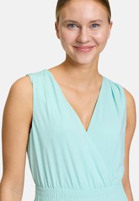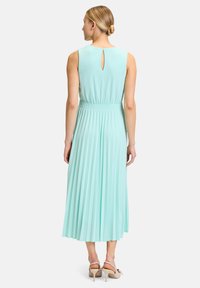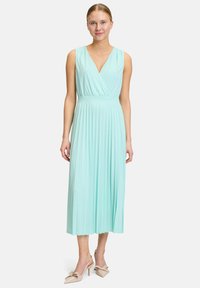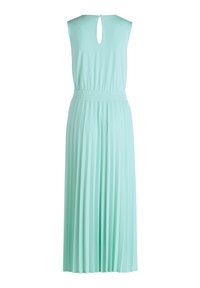 Ein mintgrünes, plissiertes Kleid mit tiefem V-Ausschnitt und tailliertem Bund. Der Stoff ist glatt und leicht und sorgt für eine fließende Silhouette.