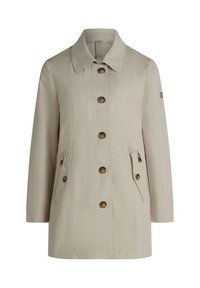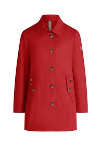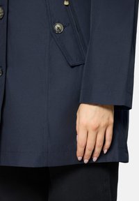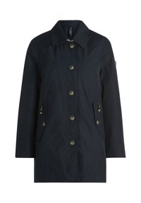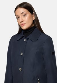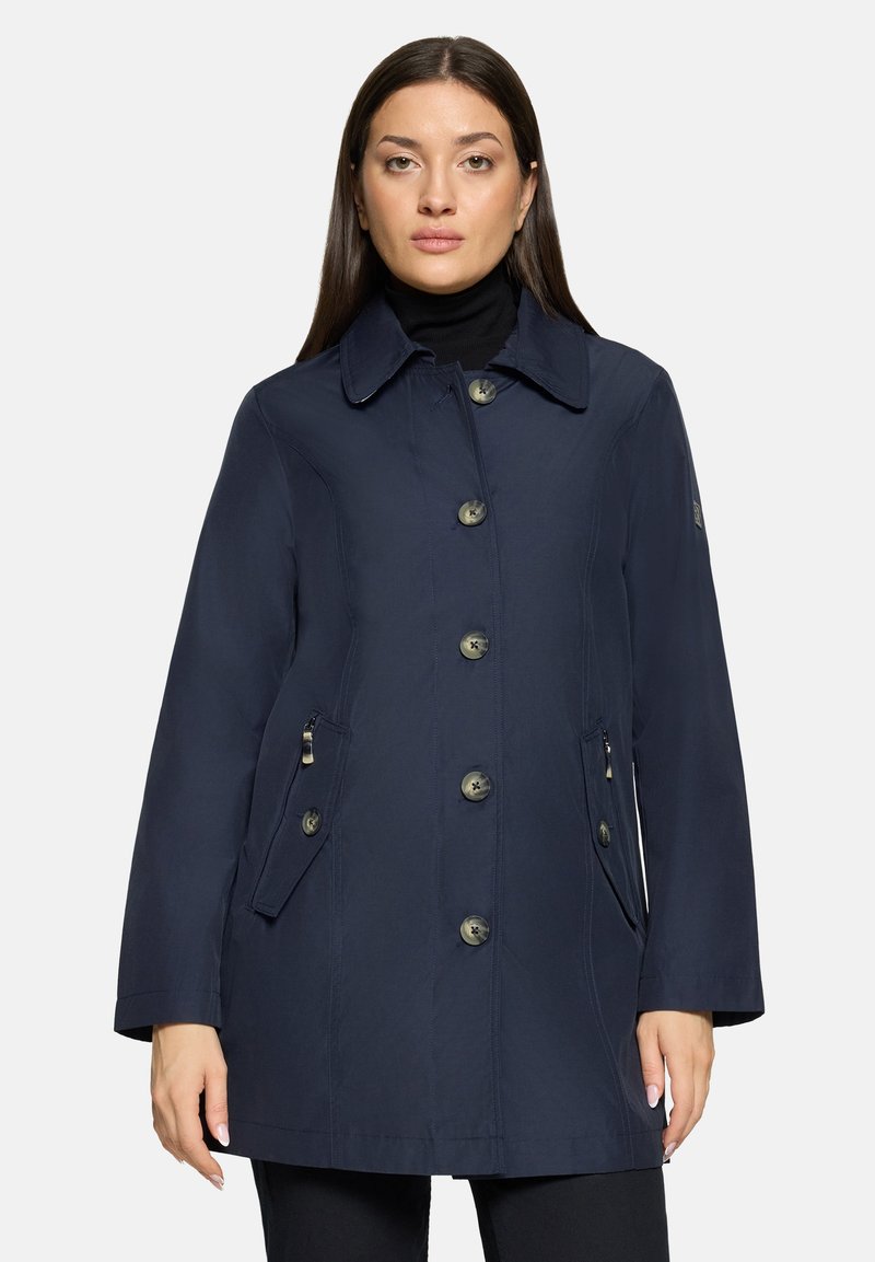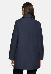 Marineblauer Mantel mit Kragen, vorderer Knopfleiste und zwei Reißverschlusstaschen. Verfügt über eine glatte Textur und eine schlanke Silhouette.