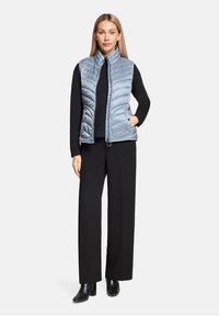 Hellblaue gesteppte Weste mit hohem Kragen, Reißverschluss vorne und Seitentaschen. Verfügt über ein gestepptes Muster und silberne Metallakzente.