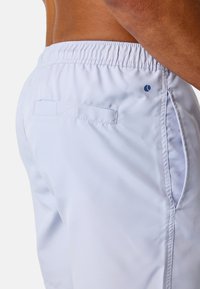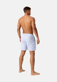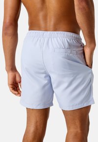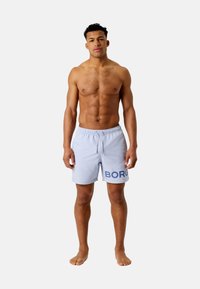 Männlicher Torso, der hellblaue Badeshorts mit dem dunkelblau aufgedruckten Schriftzug „BORG“ am linken Bein vor einem einfarbigen Hintergrund trägt.