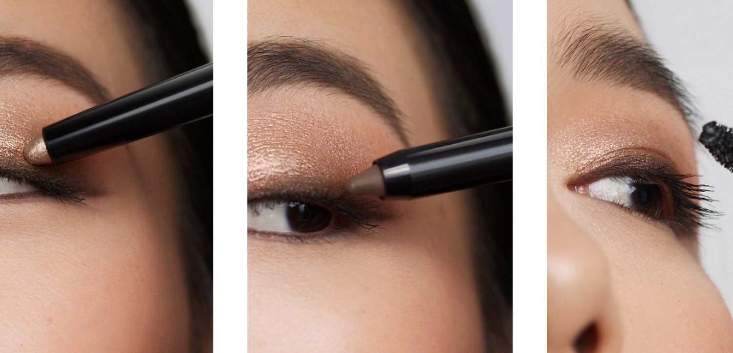 Long-Wear Cream Shadow in Golden Amber, Cream Liner Stick in Rich Chocolate und Smokey Eye Mascara.